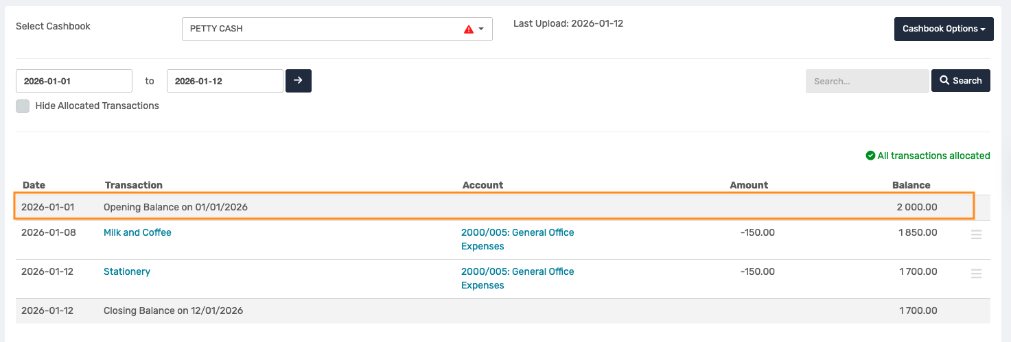 Important: Ensure that the Petty Cash Cashbook is selected on the Cashbook page before uploading the statement. ![]() |
